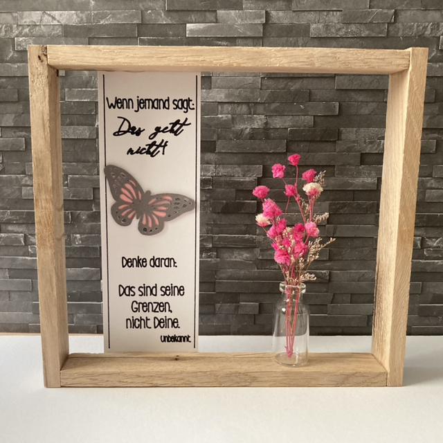 Rahmen aus Kantholz mit einem Zitat bzw. einer Weisheit, ca. 17,5 x 16 cm (BxT), mit einer Holzkugel und einem kleinen Trockenblumen-Arrangement